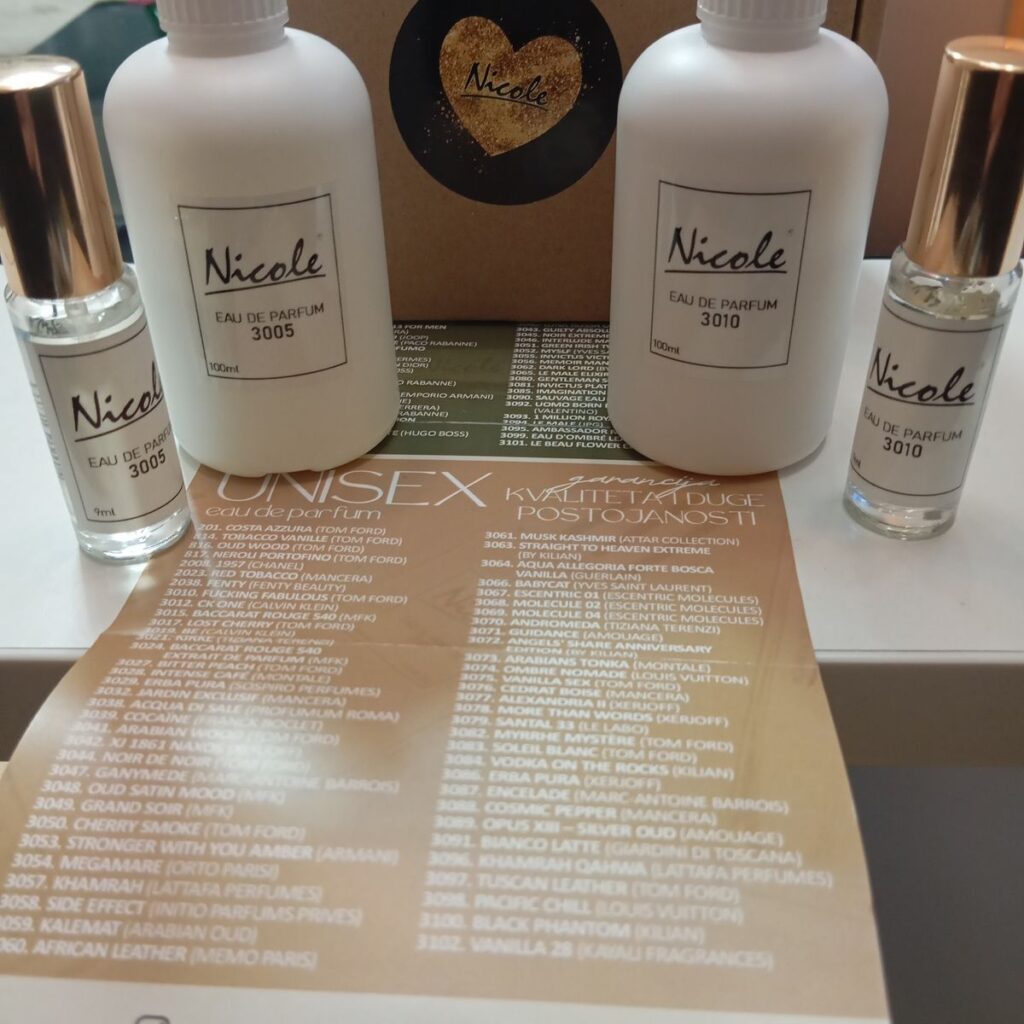 Nicole parfemi bazirani su na visokokvalitetnim mirisnim esencijama i pakuju se u elegantne bočice od 30 ml, 50 ml i 100 ml. Na taj način ne plaćate skupu dizajnersku ambalažu i ime brenda, već dobijate miris inspirisan originalnim parfemima po pristupačnoj ceni.